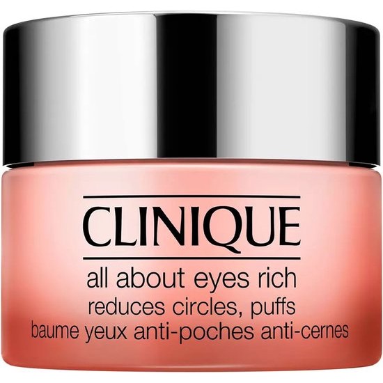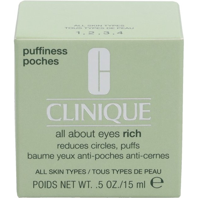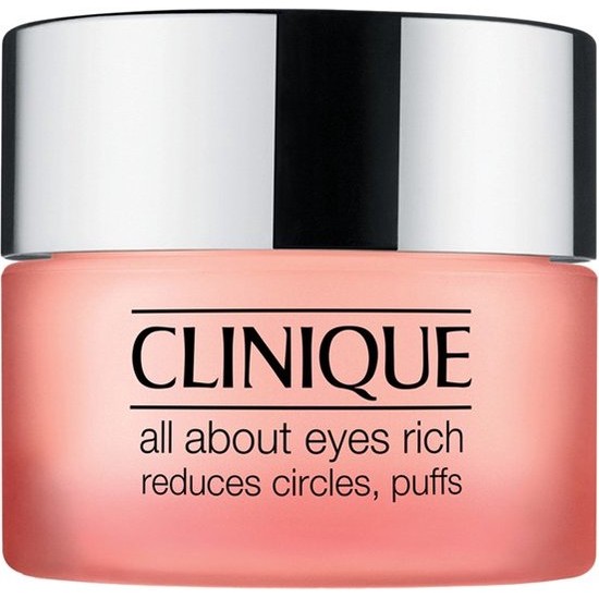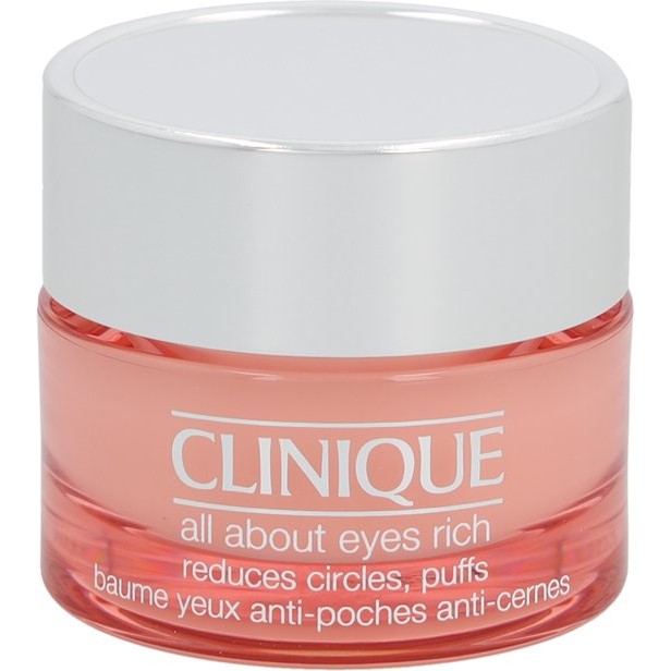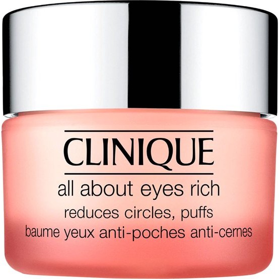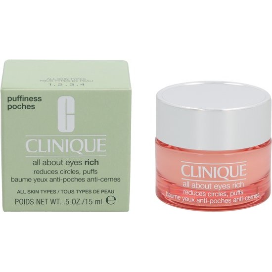 Clinique Eye Treatment All About Eyes Rich This moisture-rich eye crA me helps reduce dark circles, fine lines and swelling around the eyes The skin is soothed, softened and protected thanks to powerful antioxidants and anti-irritants The collagen production is supported and the moisture barrier of the skin is protected against free radicals. The cream is also 100 perfume free and tested for allergies. Use Apply the cream to the skin in the morning and evening. Pat it in with your fingertips on the skin. entire skin around the eyes including eyelid until the product is absorbed