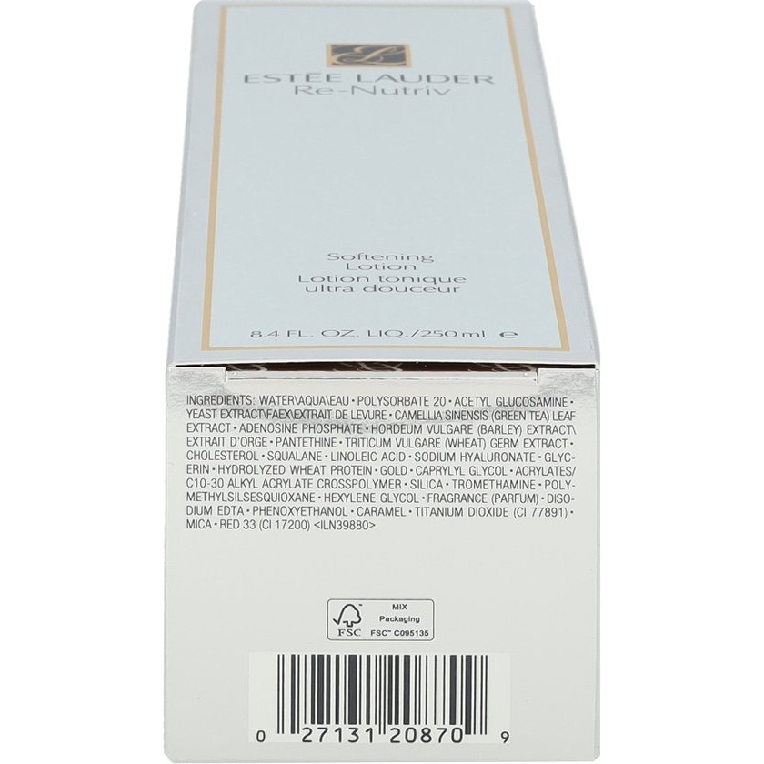 Estee Lauder Re Nutriv Softening Lotion This wonderfully refreshing lotion removes impurities and makes the skin surface smooth, soft and fresh This silky texture envelops the skin with an invisible layer of hydration The skin is prepared for the coming care Tested by dermatologists Use Wipe a soaked cotton pad over the face after cleansing with Re nutriv Intense Hydrating Cream Cleanser