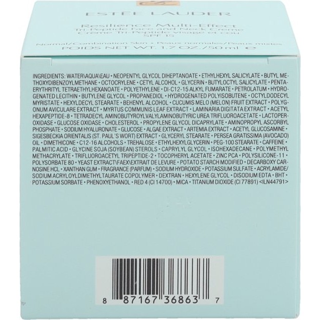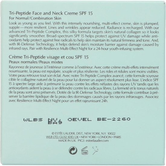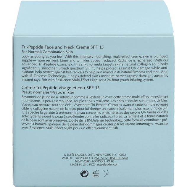 EstA c e Lauder Resilience Multi Effect Tri Peptide Face and Neck Creme This facial cream that is suitable for normal-combination skin makes the skin smoother, softer and more supple Collagen production is increased the skin becomes smoother and wrinkles become less visible The skin remains hydrated and looks radiant Use Apply the crA me every morning to the face and neck