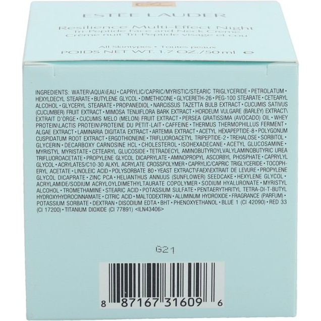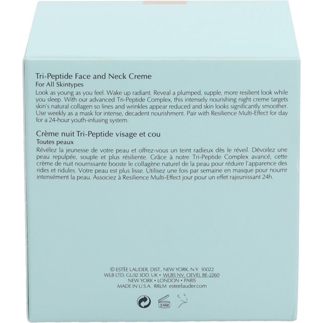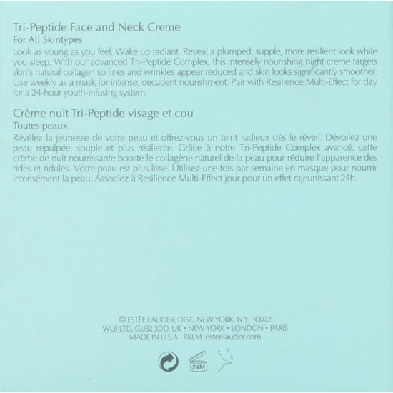 Estee Lauder Resilience Lift Night Lifting Firming Face and Neck Creme This intensely nourishing moisturizing night cream and weekly mask in one optimally restores the skin. The nourishing cream is enriched with a powerful Tri Peptide Lift Complex and makes the skin noticeably more elastic, firmer and smoother. Fine lines and neck wrinkles fade, creating a youthful look. Use Apply the cream every evening to the face and neck. Or use it as a mask. Then apply the cream. Apply generously to the face and neck once a week, let it work for 10 minutes and then remove the cream with a cloth