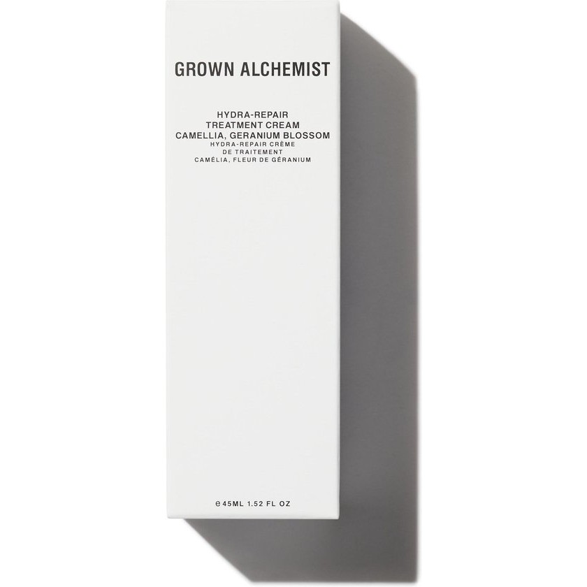 Grown Alchemist Hydra Repair Treatment Cream Camellia/Geranium Blossom This ultra rich non-greasy facial cream is formulated to achieve maximum hydration without leaving residual oil on the skin or leaving the skin shiny. rich velvety cream of this formulation leaves facial skin hydrated looks soothing and soft Use twice a week as a mask for dry and/or aging skin Ideal for travel cold climates recovery from skin injuries and after medical or dermatological procedures Use Apply circular movements work from the center of the face to the neck and décolleté Push gently to improve hydration Use morning and evening after cleansing Suitable for all skin types