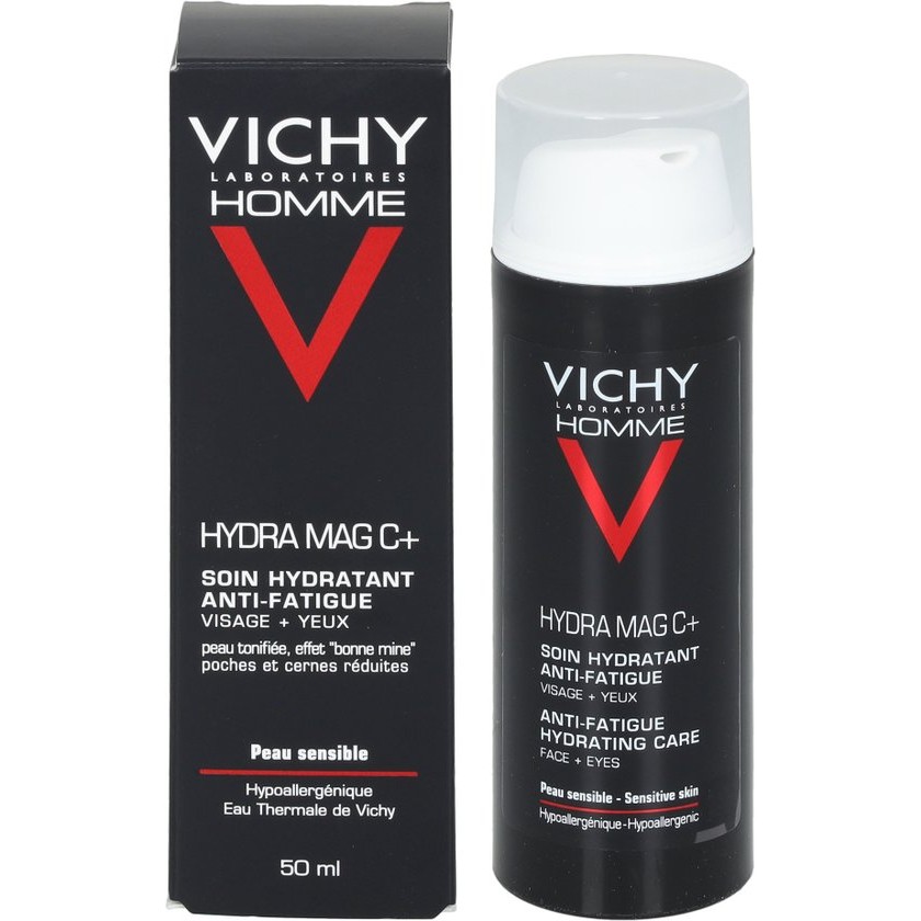 Vichy Homme Hydra Mag C Anti Fatigue Hydrating Care A moisturizing anti-fatigue care for the face and eye contour Gives a fresh appearance and a radiant complexion Reduces bags and dark circles Suitable for sensitive skin skin hypoallergenic Use Apply to the clean skin of the face and neck