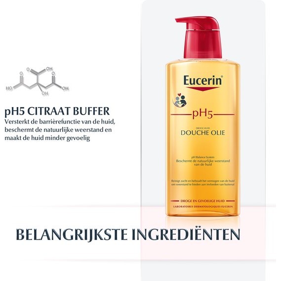 Eucerin PH5 Shower Oil The Shower Oil has been specially developed by Eucerin for the specific needs of sensitive dry skin Cleanses mildly and foams pleasantly Leaves a protective lipid film on the skin Your skin is protected against dehydration, even with regular showering The skin feels silky soft and supple The PH5 EnzymeProtection from Eucerin has proven to preserve the skin’s natural defense system The special combination with the PH5 citrate buffer and extremely mild ingredients protects the skin’s own enzymes and strengthens the protective acid mantle