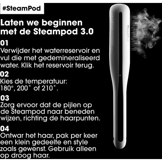 LOreal Steampod 3 0is the iconic straightener that ensures that your hair is transformed into the ideal look with 91 less damage The Steampod 3 0 is the third generation of the iconic steam straightener This steam straightener uses the power and softness of steam to transform and protect your hair With this way of styling your hair suffers up to 91 less damage than when using a normal straightener it is 2x faster and your hair also feels much softer Create all looks with ease with incredible smoothness and shine If you liked the Steampod 2 0 then the Steampod 3 0 will definitely make your heart beat faster With its lighter and thinner design styling has never been easier The 360deg rotating extra long cord makes this tool more versatile than ever and with this cool tool you can also create wavy effects The ideal tool for quick and easy styling of even the most unruly hair Key Features Steam straightener 3 0 Up to 91 less damage Instrumental test vs using Steampod without steam and comb after 15 uses 2x faster to use and your hair feels 2x softer Instrumental test versus SteamPod 3 0 without steam and comb Incredible smoothness and shine 360deg rotating cord Beach waves effect 37 lighter and 14 thinner Integrated heat reservoir Easy to carry Instructions Add water to the water tank preferably demineralized water Choose the temperature according to your hair type it makes no sense to set the steampod 3 0 warmer than necessary You can put the steampod 3 0 on average 50 degrees cooler than usual to still achieve the same results as you are used to from any straightener Place the hair in the middle of the plates and make sure the arrows are pointing down during the straightening process Move the tool slowly to get better results