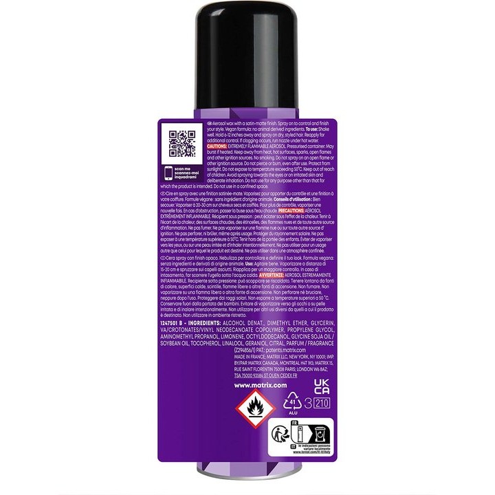 Matrix Builder Wax Spray 250 ml is a wax with a matte satin-like finish. With the spray you can keep your hair better under control, so that your look stays in place all day long! The spray gives your hair more texture and body. Key Features * Gives your look a satin-matte finish. * Provides texture and body. *Vegan. * Keeps your hair in shape and under control. * Easy to use. Instructions for use * Shake well. * Keep a distance of 10-20 centimeters and spray on dry, styled hair. *Reapply for extra control. Ingredients ALCOHOL DENAT., HYDROFLUOROCARBON 152A, AQUA / WATER / EAU, GLYCERIN, VA/CROTONATES/VINYL NEODECANOATE COPOLYMER,PROPYLENE GLYCOL, AMINOMETHYL PROPANOL, LIMONENE, OCTYLDODECANOL, GLYCINE SOY OIL / SOYBEAN OIL, TOCOPHER OL, LINALOOL, GERANIOL, PERFUME / FRAGRANCE . Buy Matrix Vavoom Builder Wax Spray 250 ml online at Shop the Matrix Vavoom Builder Wax Spray 250 ml online and we will ensure that it is delivered to you as soon as possible!