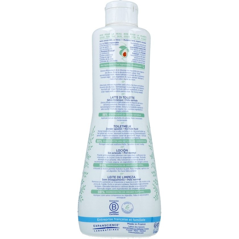 Mustela BA c bA c Lait de Toilette Toilet Milk Specifically formulated for use from birth, the Toilet Milk is ideal for your baby’s toilet care. The skin of the face and bottom is perfectly cleansed in all softness. and without dehydration The skin is hydrated and the hydrolipidic film is preserved thanks to a complex of vegetable oilsA