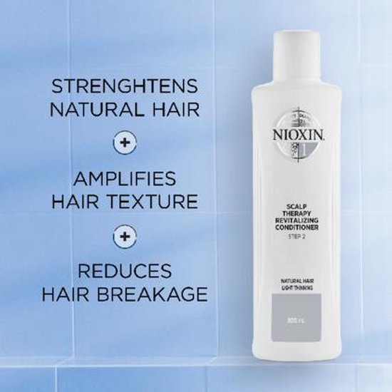 Nioxin System 1 Step 2 Scalp Therapy Revitalizing Conditioner This conditioner is intended for normal to thin-looking hair The scalp is refreshed and provides the hair with a beautiful natural shine The conditioner helps the to maintain resistance and moisture balance Free from SLS sulfates and perfume Use First wash the hair with shampoo and apply the conditioner to towel-dried hair. Divide the conditioner and let it work for 1 to 3 minutes and rinse thoroughly