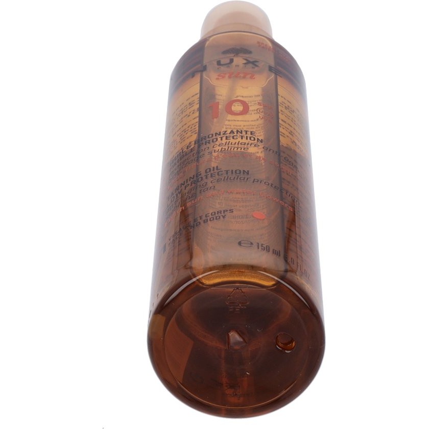 Nuxe Sun Huile Bronzante SPF10 A tanning oil with a low protection level with Water Hyacinth and Sunflower Use Apply the product liberally before going into the sun