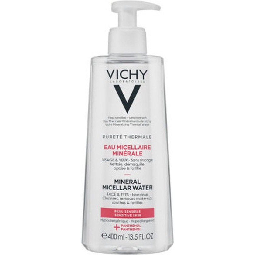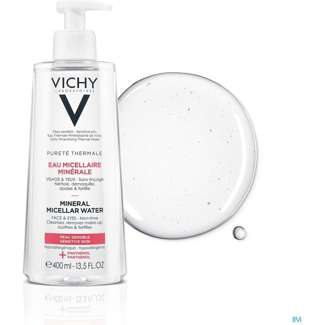Vichy Purete Thermale Mineral Micellar Water A powerful micellar cleansing water enriched with Vichy Mineralizing Water and soothing Panthenol Cleanses face and eyes in A c A c n treatment and removes make-up Provides calm, clean skin without a tight feeling. Use Apply the lotion to a cotton pad and gently cleanse the face to remove dirt and make-up. Use in the morning and evening. No need to rinse.