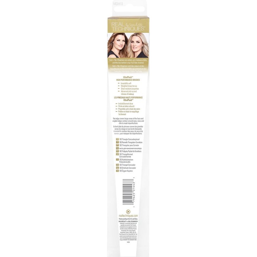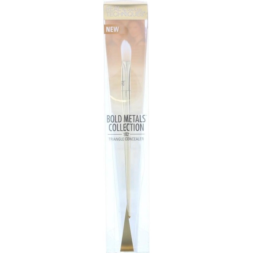 Real Techniques Bold Metals 102 Traingle Concealer Ref 01443 The triangle concealer brush with a flat edge covers large parts of the face and the slanted edges around the eye contour, nose and chin to reduce imperfections to mask