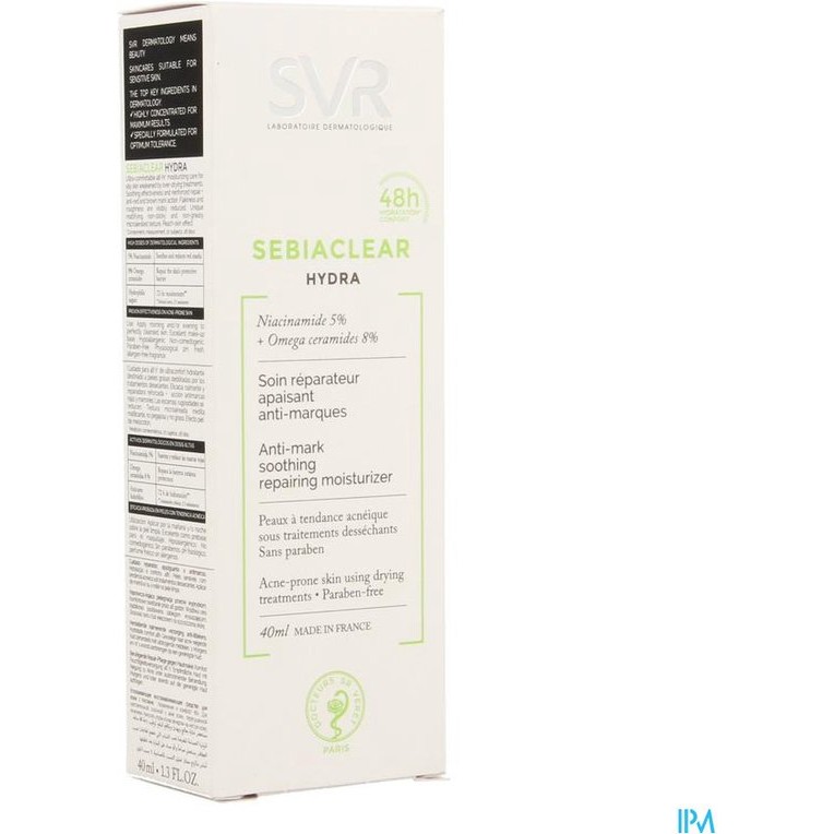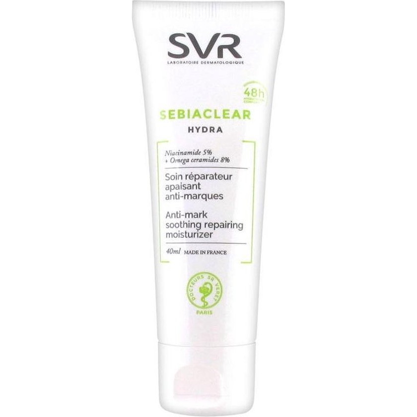 SVR Sebiaclear Hydra Soin Repairer Apaisant Anti Marques This cream has a moisturizing effect and restores the skin that has been treated with drying agents to heal acne, for example. Prevents the appearance of red and brown stripes and reduces flaking and rough skin Use Apply in the morning and/or evening to clean skin Can be used as a base for make-up