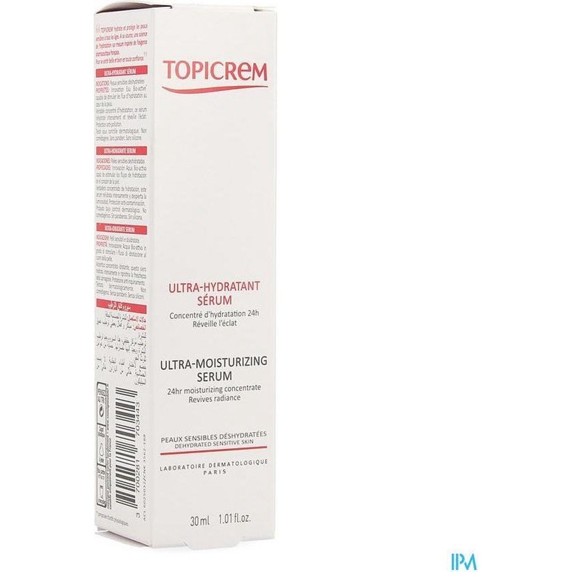 Topicrem Ultra Hydratant Ultra Moisturizing Serum Ultra Hydrating Serum This ultra hydrating serum has been developed for sensitive, dehydrated skin. Innovative bio active ensures that moisture supply is stimulated. The serum is a concentrate that actually provides intense moisture and gives the skin its glow back Without parabens and silicones Use Apply the serum to the face and neck in the morning and evening