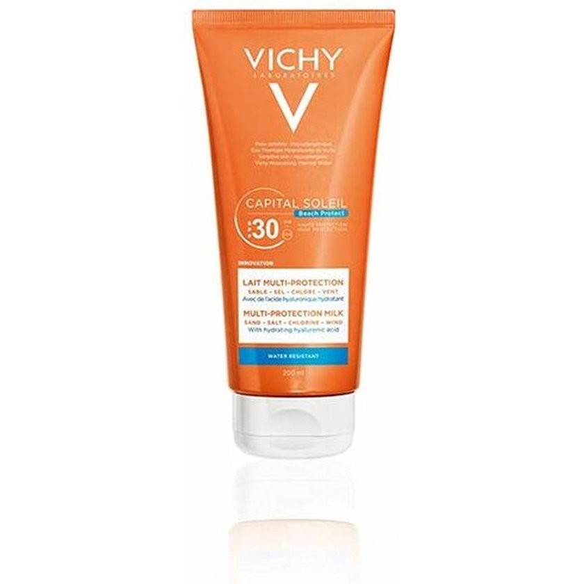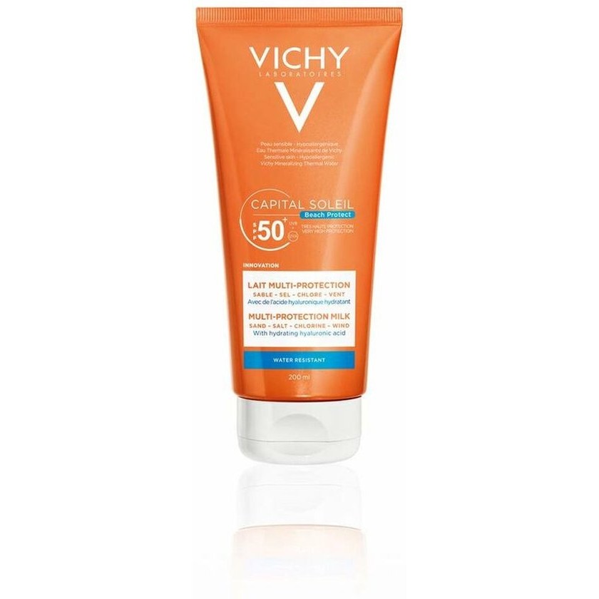 Vichy Ideal Soleil Lait Multi Protection SPF50 This sunscreen milk has been specially developed for sensitive skin. The milk is enriched with soothing, strengthening and restorative thermal spring water from Vichy. The skin is protected against sunburn and skin aging. The texture is enriched with hyaluronic acid to make it easy to apply the milk without the skin turning white and getting a greasy layer. Suitable for both body and face. Use Apply the milk liberally and regularly to the face and body